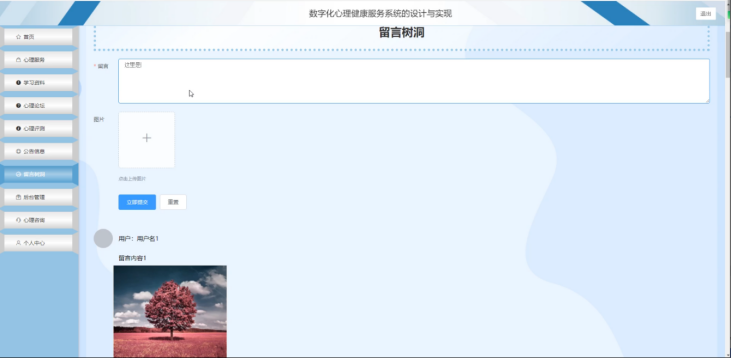 留言树洞:在留言树洞页面输入留言信息和上传图片进行立即提交或重置实现留言,并根据需要对留言内容进行回复操作,留言板页面如图5-4所示: