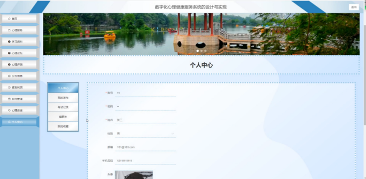 管理员进入主页面,主要功能包括对个人中心、客户管理、心理咨询师管理、心理服务管理、在线咨询管理、咨询回复管理、服务预约管理、资料分类管理、学习资料管理、留言树洞、心理论坛、心理评测管理、试题管理、系统管理、考试管理、考试记录等进行操作。管理员主页面如图5-7所示: