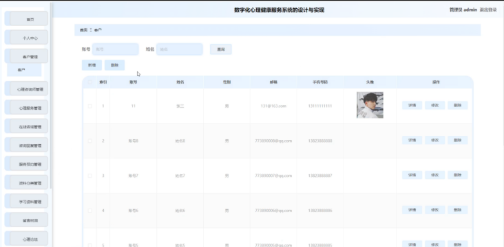 管理员点击客户管理。在用户页面输入账号和姓名进行查询、新增或删除用户列表,并根据需要对用户详情信息进行详情、修改或删除操作;如图5-8所示: