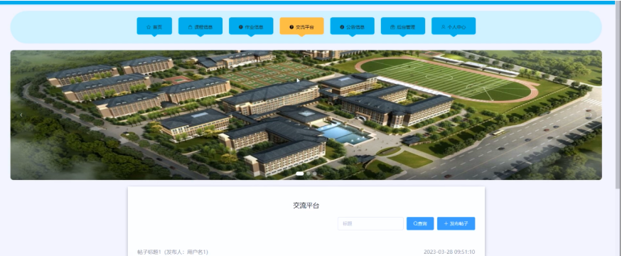 当学生进入该系统前台后,进入系统主页,主页包括查看首页、课程信息、作业信息、交流平台、公告信息、管理个人中心、进行后台管理,具体效果如图2所示。
