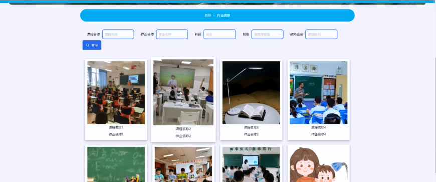 点击作业信息,学生在这里可以输入课程名称、作业名称、科目、班级、教师姓名进行查询作业信息,并可以对作业信息进行下载和提交等操作,如下图所示。
