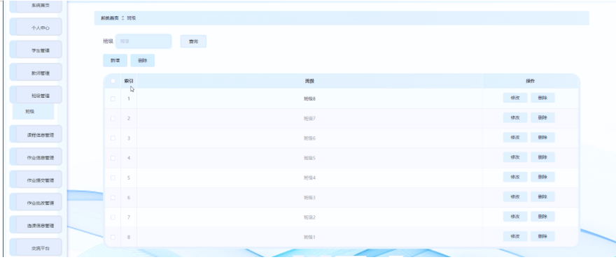 班级管理:管理员可对班级信息进行查询、新增、修改和删除操作。