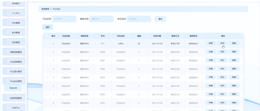 作业批改管理:教师可对学生提交的作业进行批改,并给出评分和评语。
