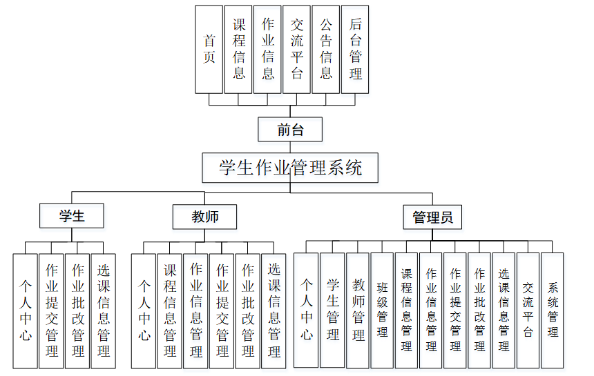 该系统的用户主要是管理员、教师和学生。教师可以管理个人信息和登录密码,发布课程信息和作业信息,而学生负责完成课程和作业提交。管理员可以管理系统的所有信息,包括:个人中心、学生管理、教师管理、班级管理、课程信息管理、作业信息管理、作业提交管理、作业批改管理、选课信息管理、交流平台、系统管理。