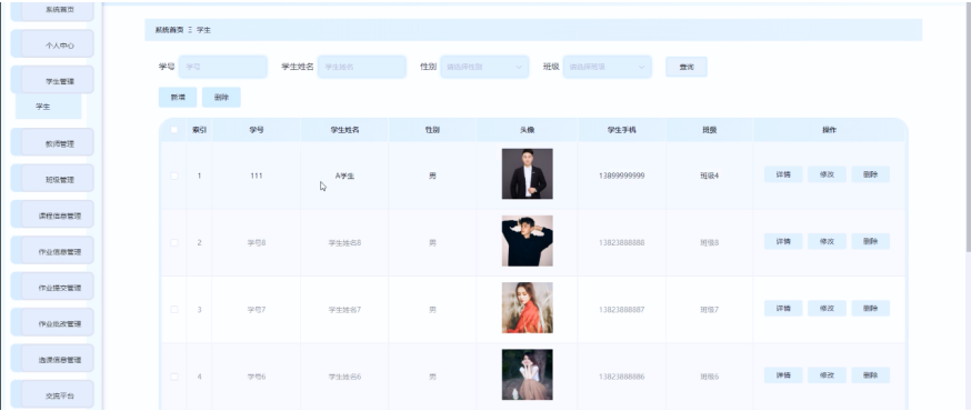 管理员登录本系统后,可以管理个人中心、学生管理、教师管理、班级管理、课程信息管理、作业信息管理、作业提交管理、作业批改管理、选课信息管理、交流平台、系统管理这些功能模块;点击学生管理,管理员可以管理学生信息。如图5-8所示。