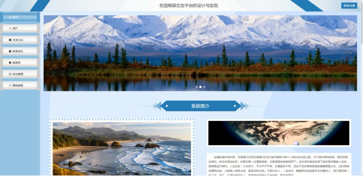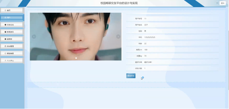 通过用户注册与登录功能,平台确保了用户身份的唯一性和安全性。个人中心管理让用户能够轻松更新个人信息,管理自己的社交圈。好友列表管理则方便用户添加和维护好友关系。信息发送与接收功能支持用户之间的即时交流,而留言板和交友论坛则为用户提供了一个开放的交流空间,便于分享经验和交流心得。此外,新闻资讯发布功能能够及时推送校园动态,智能客服则为用户提供便捷的咨询服务。