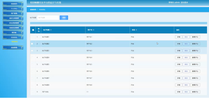 管理员点击交友论坛。在交友论坛页面输入帖子标题进行查询交友论坛列表,并根据需要对交友论坛详情信息进行详情、修改或查看评论操作;如图5-14所示: