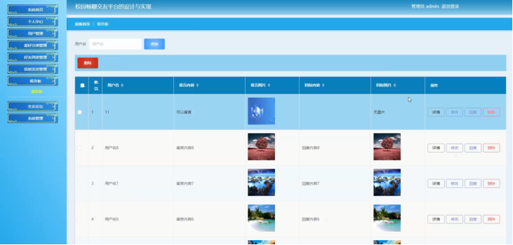 管理员点击留言板。在留言板页面输入用户名进行查询或删除留言板列表,并根据需要对留言板详情信息进行详情、修改、回复或删除操作;如图5-13所示: