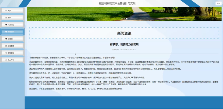 (1)对零碎化、分布散的校园畅聊交友信息进行收纳、整理,通过网络服务平台使这些信息内容更加调理,更加方便化和清晰化,让访问该系统的每个用户享受浏览的过程。