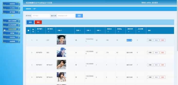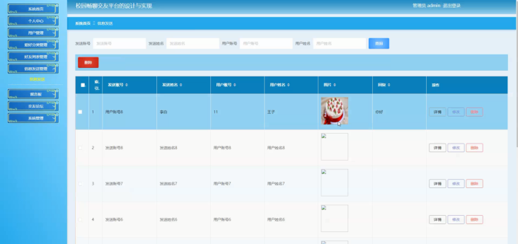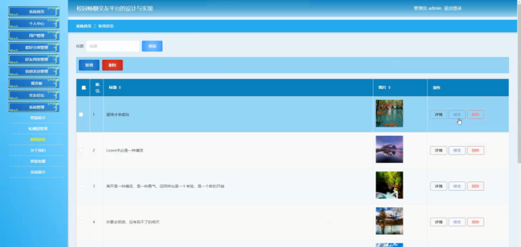 (4)管理员通过后台系统来完成对校园畅聊交友信息的编辑,包括添加、删除等操作。