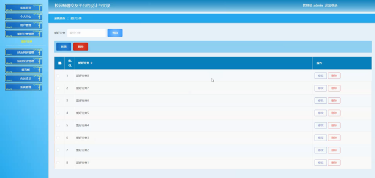 管理员点击爱好分类管理。在爱好分类页面输入爱好分类进行查询、新增或删除爱好分类列表,并根据需要对爱好分类详情信息进行修改或删除操作;如图5-10所示: