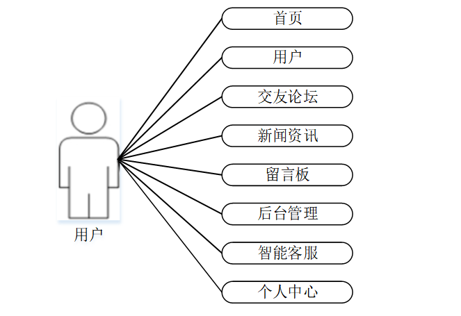 (2)、用户关键功能包含首页、用户、交友论坛、新闻资讯、留言板、后台管理、智能客服、个人中心等进行操作。用户用例如下: