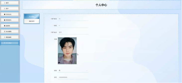 个人中心:在个人中心页面输入个人信息可以进行更新操作,还可以对我的发布进行详细操作;如图5-6所示:
