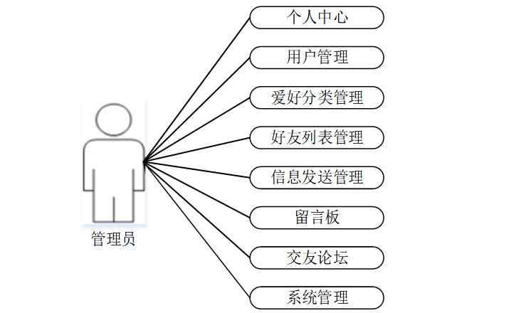 (1)、管理员关键功能包含个人中心、用户管理、爱好分类管理、好友列表管理、信息发送管理、留言板、交友论坛、系统管理等进行管理。管理员用例如下: