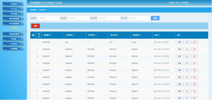 管理员点击好友列表管理。在好友列表页面输入发送账号、发送姓名、用户账号和用户姓名进行查询或删除好友列表,并根据需要对好友列表详情信息进行详情、修改或删除操作;如图5-11所示: