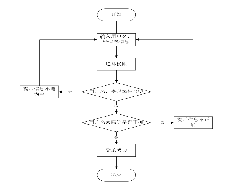 登录流程实现了管理员和用户的登录,在登录页面需要用户填写自己的信息,前端页面会将信息传递给后端接口,然后查询数据库确定该身份有效后登录成功,否则此用户登录失败,需要重新填写信息,进行再次验证,如图3-3所示。