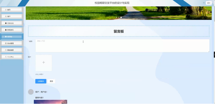留言板:在留言板页面输入留言内容和上传图片可以进行立即提交或重置操作;如图5-5所示: