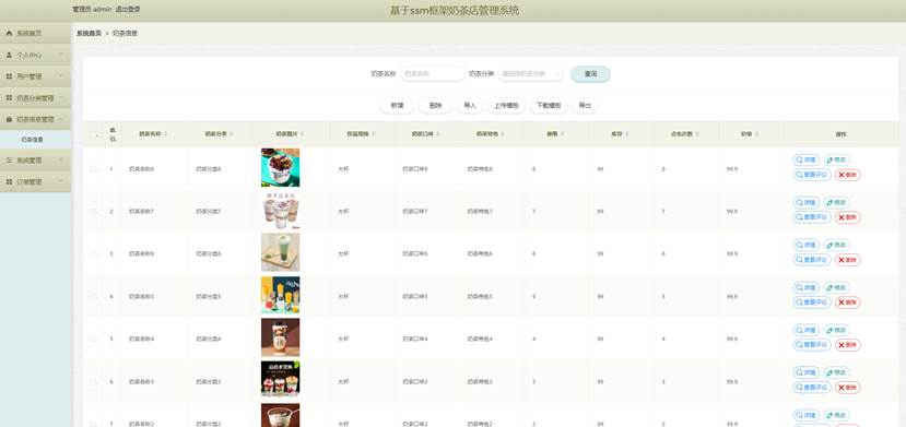 管理员点击奶茶信息管理,在奶茶信息管理页面的输入奶茶名称、奶茶分类、奶茶图片、饮品规格、奶茶口味、奶茶特色、单限、库存、点击次数、价格等内容,进行查询、新增、导入、上传模块、下载模块、导出或者删除奶茶信息等操作,如图5-11所示。