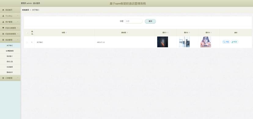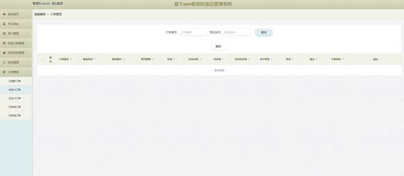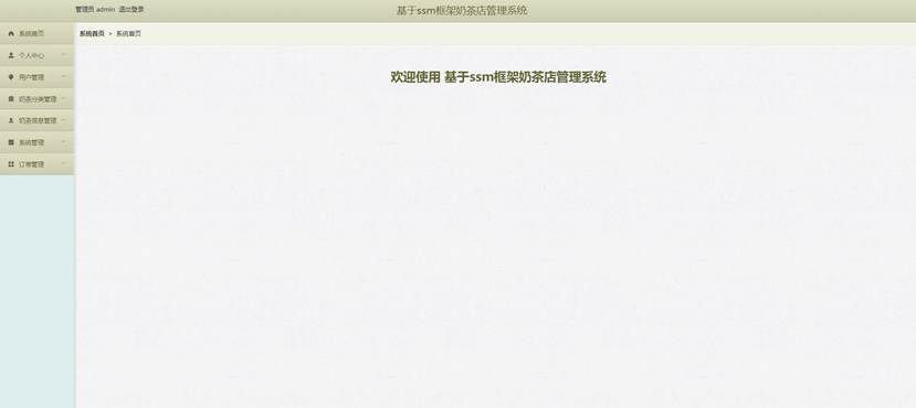 管理员登录进入奶茶店管理系统可以查看系统首页、个人中心、用户管理、奶茶分类管理、奶茶信息管理、系统管理、订单管理等信息,进行相应操作,如图5-8所示。