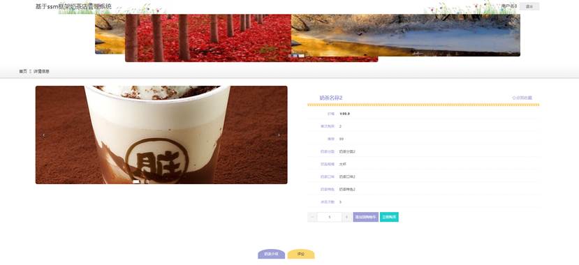 用户点击奶茶信息,在奶茶信息页面的搜索栏输入奶茶名称、奶茶分类等信息,进行查询,然后还可以查看奶茶名称、奶茶分类、奶茶图片、饮品规格、奶茶口味、奶茶特色、单限、库存、点击次数、价格等信息,进行添加购物车、立即购买、收藏或者评论等操作;如图5-3所示: