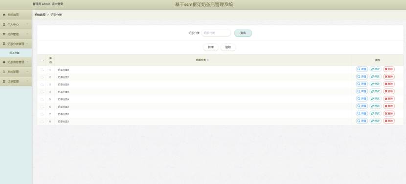 管理员点击奶茶分类管理,在奶茶分类管理页面的输入奶茶分类等内容,进行查询、新增或者删除奶茶分类等操作,如图5-10所示。