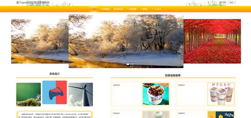 当游客打开系统的网址后,首先看到的就是首页界面。在这里,游客能够看到奶茶店管理系统的导航条显示首页、奶茶信息、系统公告、在线客服、购物车、个人中心。系统首页界面如图5-1所示:
