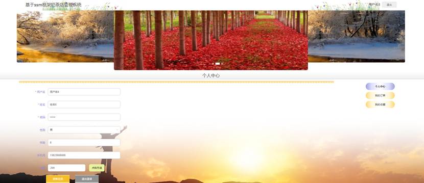 在个人中心页面可以输入个人详细信息,进行信息更新操作,还可以对我的订单、我的收藏进行详细操作,如图5-6所示: