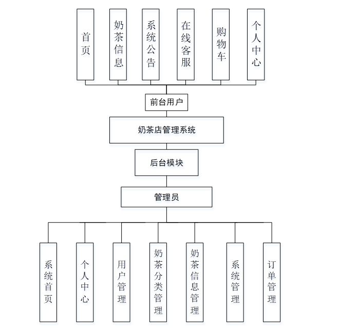 本系统采用自上往下的方法开发与实现,本课题要求实现一套奶茶店管理系统,系统主要包括管理员模块和用户模块的功能模块;