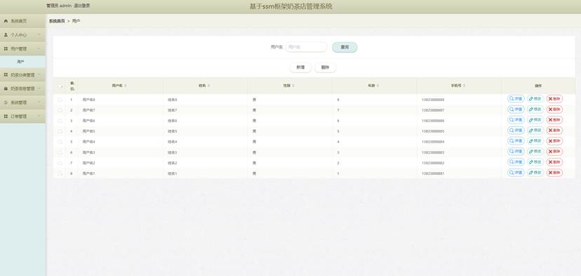 管理员点击用户管理,在用户管理页面的输入用户名、姓名、性别、年龄、手机号等内容,进行查询、新增或者删除用户信息等操作,如图5-9所示。