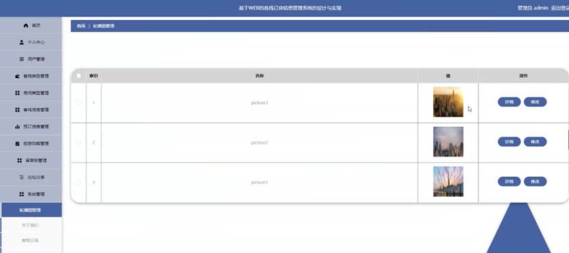 系统管理;在轮播图管理页面进行查询或删除轮播图详细信息,还可以对关于我们、客栈公告页面进行详细操作;如图5-15所示。