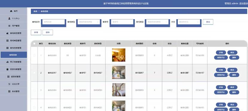 客栈信息管理;在客栈信息页面通过输入栈名称,客栈类型,客房号,房间类型,状态进行查询,新增或删除客栈信息详细信息,并进行详情,修改,查看评论或删除等操作;如图5-10所示。