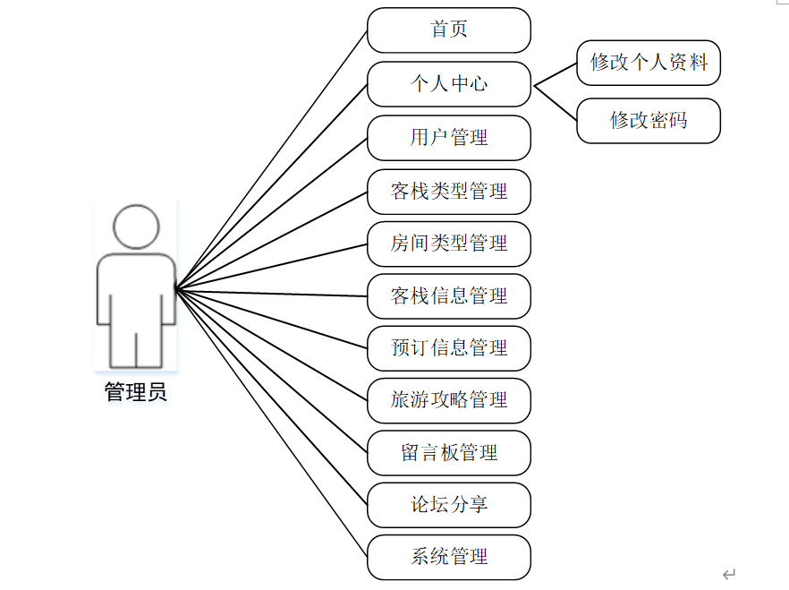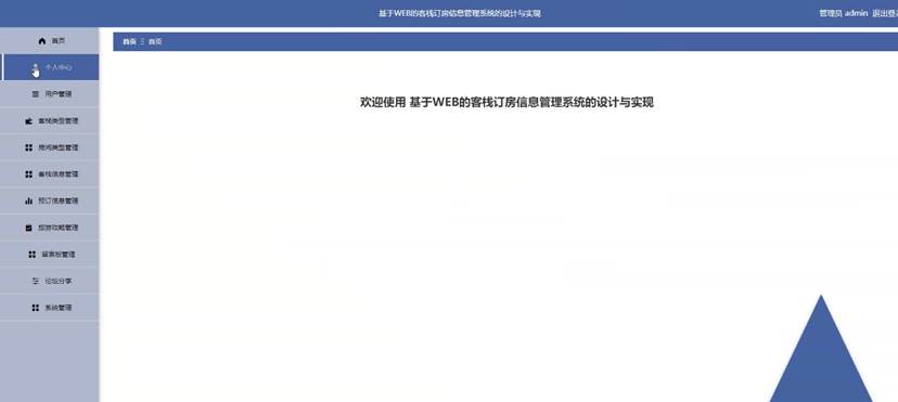管理员端的功能主要是开放给系统的管理人员使用,能够对用户的进行管理,包括对首页,个人中心,用户管理,客栈类型管理,房间类型管理,客栈信息管理,预订信息管理,旅游攻略管理,留言板管理,论坛分享,系统管理等,对系统整体运行情况进行了解。