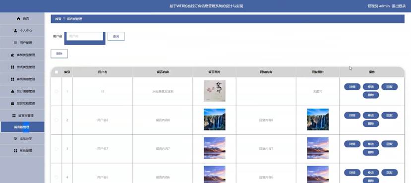 留言板;在留言板页面通过输入用户名进行查询或删除留言板信息,并进行详情,修改,回复或删除等操作;如图5-13所示。