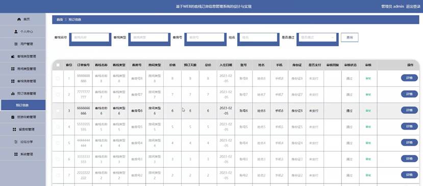 预订信息管理;在预订信息页面通过输入客栈名称,客栈类型,客房号,姓名,是否通过进行查询预订信息,并进行详情操作;如图5-11所示。