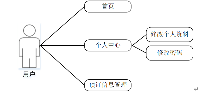 用户的功能主要是对首页,个人中心,预订信息管理进行操作。用户用例分析图,如图3-2所示。