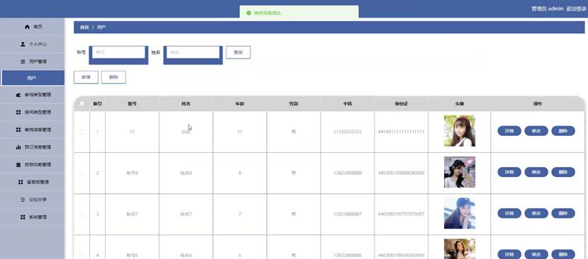 用户管理;在用户页面通过输入账号,姓名进行查询,新增或删除用户详细信息,并进行详情,修改和删除等操作;如图5-7所示。