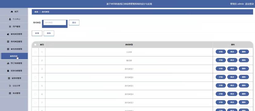 房间类型管理;在房间类型页面通过输入房间类型进行查询,新增或删除房间类型详细信息,并进行详情,修改或删除等操作;如图5-9所示。