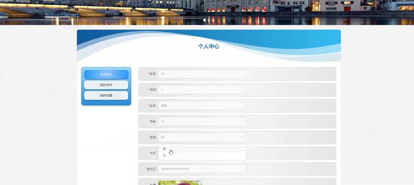 个人中心:在个人中心页面可以对个人中心、我的发布和我的收藏进行详细操作;如图5-4所示: