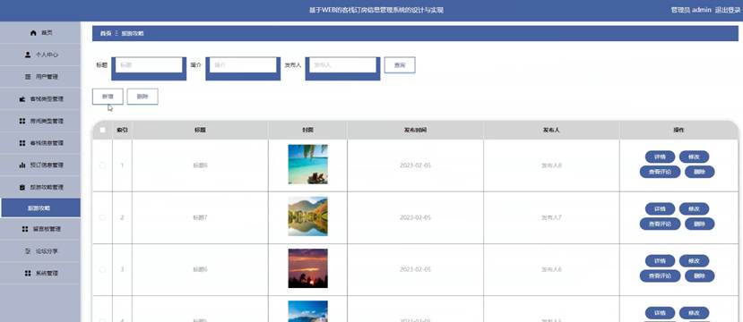 旅游攻略管理;在旅游攻略页面通过输入标题,简介,发布人进行查询,新增或删除旅游攻略详细信息,并进行详情,修改,查看评论或删除等操作;如图5-12所示。