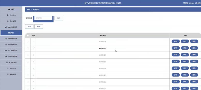 客栈类型管理;在客栈类型页面通过输入客栈类型进行查询,新增或删除客栈类型信息,并进行详情,修改或删除等操作;如图5-8所示。