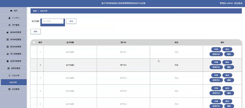 论坛分享管理;在论坛分享页面通过输入帖子标题进行查询或删除论坛分享详细信息,并进行详情,修改,查看评论或删除等操作;如图5-14所示。