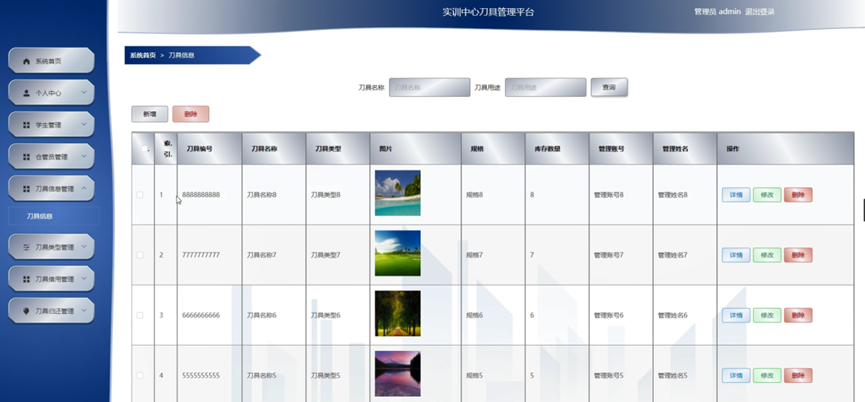 仓管员点击刀具信息管理。在刀具信息页面输入刀具名称和刀具用途进行查询、新增或删除刀具信息列表,并根据需要对刀具详情信息进行详情、修改或删除操作;如图5-12所示: