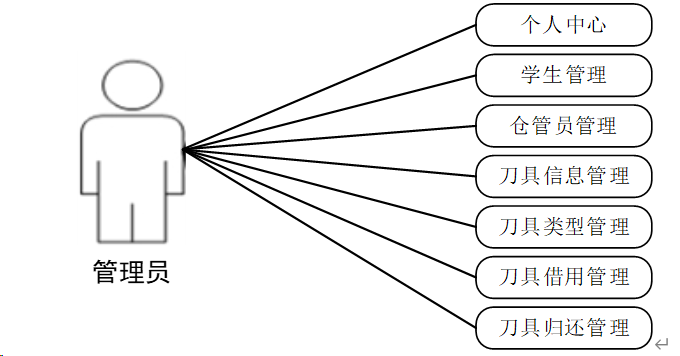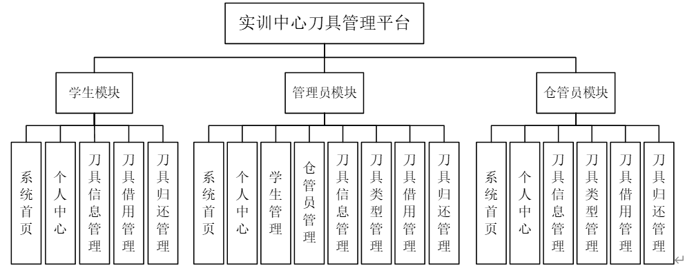该系统包含三大角色功能,管理员功能有个人中心(维护信息)、学生管理(维护学号 / 姓名 / 班级 / 联系方式)、仓管员管理(维护管理账号 / 姓名 / 电话)、刀具类型 / 刀具信息管理(分类刀具、记录刀具编号 / 名称 / 规格 / 库存)、刀具借用管理(审核借用申请 / 确认借出)、刀具归还管理(跟踪归还数量 / 检查刀具状态);仓管员功能有注册登录、个人中心(维护信息)、刀具信息管理(更新刀具库存 / 详情)、刀具类型管理(维护刀具分类)、刀具借用管理(处理借用申请)、刀具归还管理(确认归还信息);学生功能有注册登录、个人中心(维护信息)、刀具信息管理(查询刀具详情 / 库存)、刀具借用管理(提交借用申请 / 填写借用原因)、刀具归还管理(提交归还申请 / 记录归还数量)。其中,刀具信息管理存储刀具编号 / 规格 / 用途 / 库存;刀具借用管理跟踪借用数量 / 时间 / 原因;刀具归还管理记录归还数量 / 时间;学生管理存储学号 / 班级 / 联系方式。这些功能覆盖实训中心刀具管理全流程,从刀具信息维护到借用归还,从库存跟踪到人员管理,形成完整的刀具管控体系,有效解决传统管理痛点,提升实训教学服务质量与刀具利用效率。