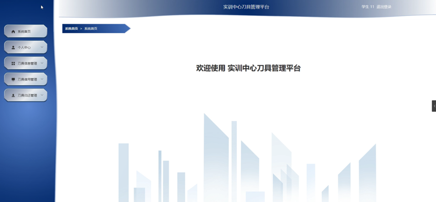学生进入系统可以对个人中心、刀具信息管理、刀具借用管理、刀具归还管理等功能进行操作。学生主页面如图5-9所示: