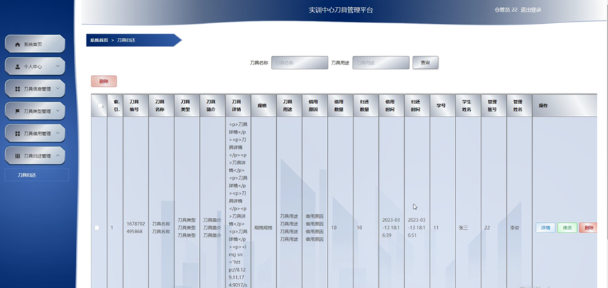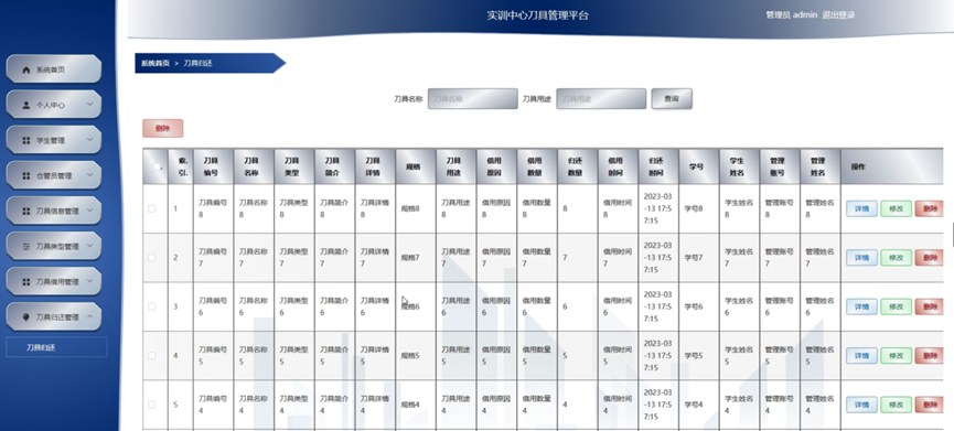 管理员点击刀具归还管理。进入刀具归还页面输入刀具名称和刀具用途进行查询或删除刀具归还列表,并根据需要对刀具归还详细信息进行详情、修改或删除操作。如图5-8所示: