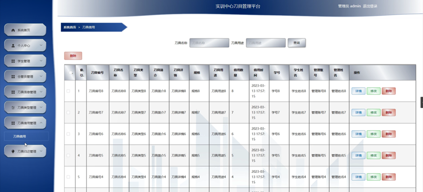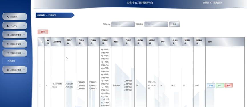 管理员点击刀具借用管理。在刀具借用页面输入刀具名称和刀具用途进行查询或删除刀具借用列表,并根据需要对刀具借用详情信息进行详情、修改或删除操作;如图5-7所示: