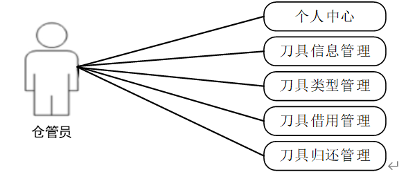 仓管员进入系统可以对个人中心、刀具信息管理、刀具类型管理、刀具借用管理、刀具归还管理等功能进行操作。仓管员主页面如图5-11所示: