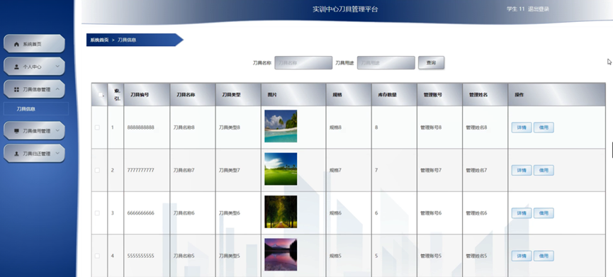 学生点击刀具信息管理。在刀具信息页面输入刀具名称和刀具用途进行查询刀具信息列表,并根据需要对刀具详情信息进行详情或借用操作;如图5-10所示: