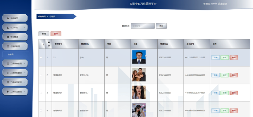 管理员点击仓管员管理。在仓管员页面输入管理账号进行查询、新增或删除仓管员列表,并根据需要对仓管员详情信息进行详情、修改或删除操作;如图5-5所示: