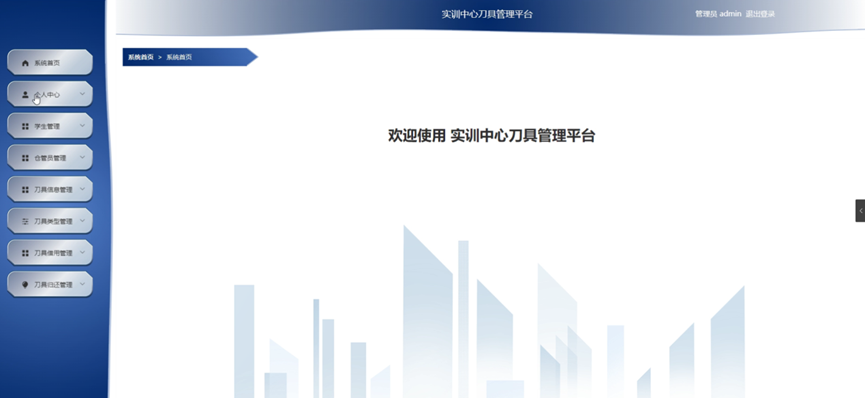 管理员进入主页面,主要功能包括对个人中心、学生管理、仓管员管理、刀具信息管理、刀具类型管理、刀具借用管理、刀具归还管理等进行操作。管理员主页面如图5-3所示: